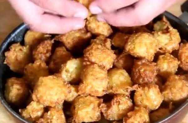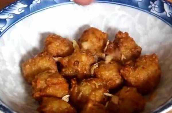 把它們放入油中開始炸,小火炸至外表金黃酥脆,炸的過程中我們要不斷的用漏勺翻面,防止粘連和炸糊,炸好以後我們給它控油撈出。這樣非常酥脆的炸丸子就完成瞭。咬上一口醇香四溢,十分好吃。