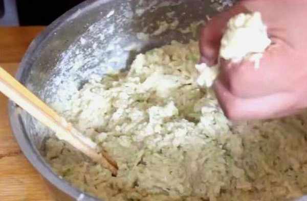 鍋中燒油油溫六成熱,這時我們戴上一次性手套,抓一些餡料在手心裡,然後輕輕的擠餡料,讓餡料從我們的大拇指和食指中間擠出,這樣擠出來基本都是圓形。