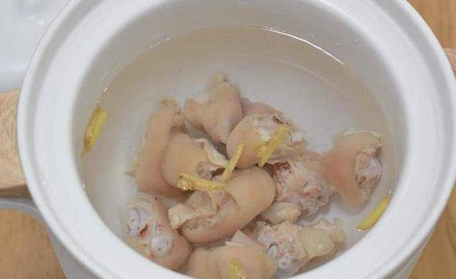 3、準備一個燉鍋,加入豬蹄,放入幾片薑,倒入適量的開水,不需要加多餘的其他調料。
