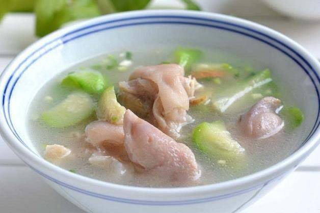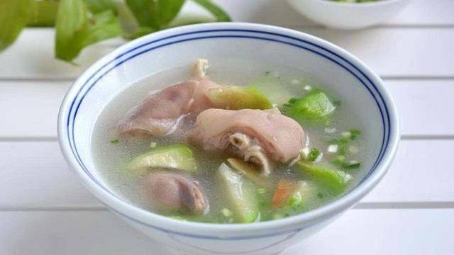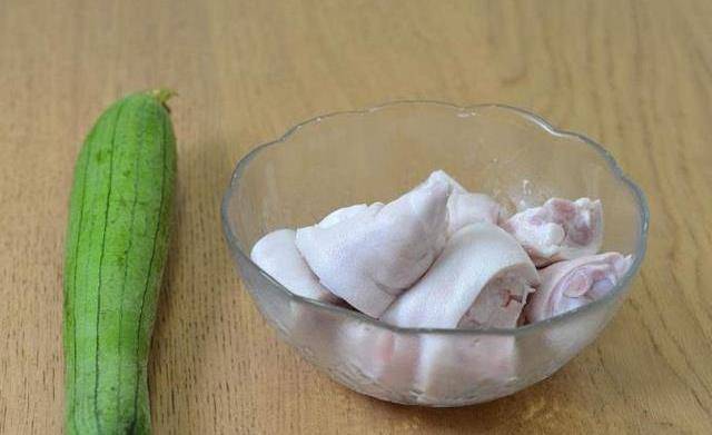 絲瓜豬蹄湯,食材:豬蹄2個、絲瓜1根、薑、蔥、鹽。步驟如下: