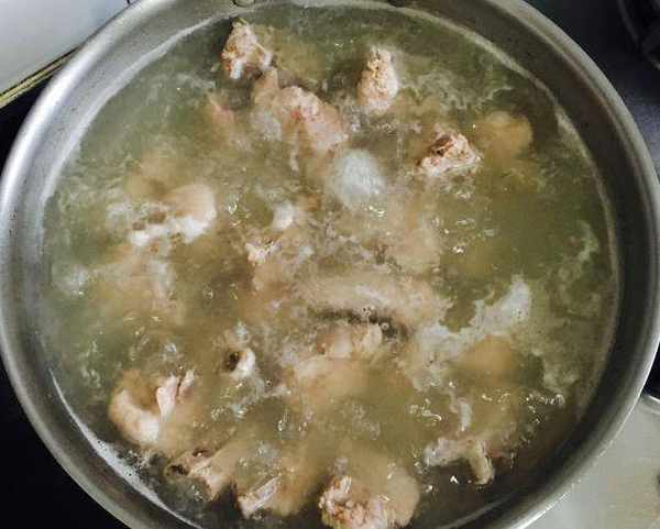 第二步:鍋中加清水,放入排骨,加入一半薑片,料酒燒開,煮出排骨血水,去除浮沫,撈出排骨,在清水中沖洗幹凈