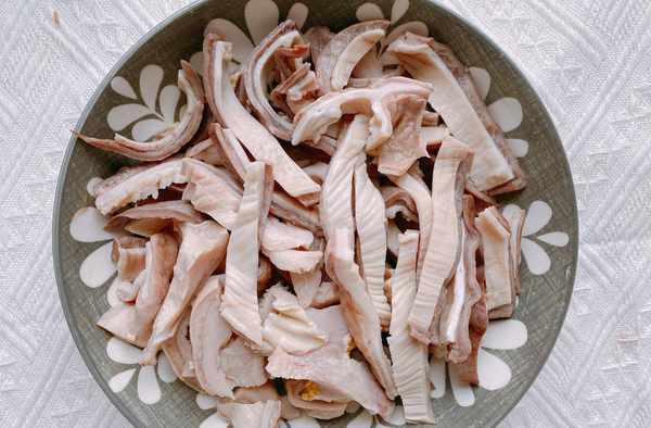 11、這時候豬肚也差不多焯水好瞭,焯好水的豬肚,馬上出鍋,不要過涼水,也不用清洗,因為表面沒有浮沫和臟東西,趁熱將它切成豬肚片,切得時候要小心燙手;