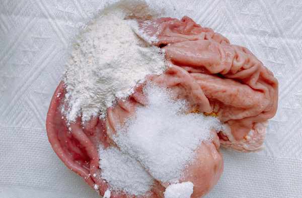 6、豬肚反過來之後需要先把裡面藏著的油脂先剪幹凈,豬肚內部可能有很多白色的油脂,這些一定要全部修剪幹凈,後面燉出來的湯才不會油,油脂剪幹凈之後,加入食鹽、面粉和白醋,按照上面說的方法抓拌,也是抓拌2-3次,抓拌好之後,完全沖洗幹凈,把豬肚翻面,再次沖洗,這樣處理過的豬肚幾乎都沒有腥味瞭;