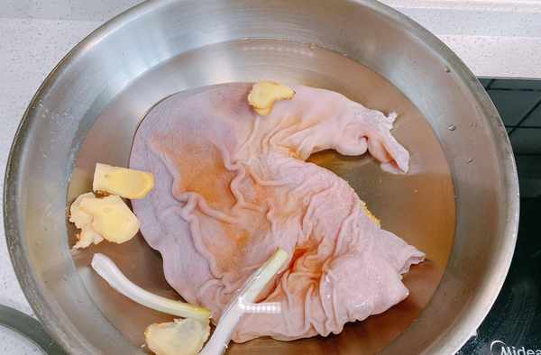 8、食材都準備好之後,豬肚開始焯水,冷水下入豬肚,加入料酒、生薑和蔥段去腥,中小火煮,慢慢加熱,這樣豬肚不會一下子收縮,後面更容易燉軟爛,燉煮過程中你會發現處理過的豬肚幾乎沒有浮沫,隻要等水慢慢煮開,然後轉小火繼續煮5-8分鐘,讓豬肚完全定型就可以;