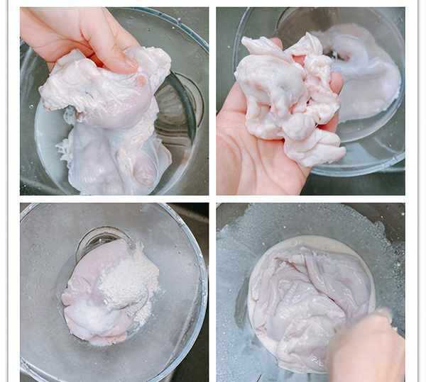 5、抓拌到感覺有明顯的粘稠度,再用清水沖洗幹凈,這個步驟需要重復2-3次,以確保豬肚表面已經完全被清洗幹凈,豬肚表面清洗幹凈之後,需要把豬肚翻過來,再次清洗;