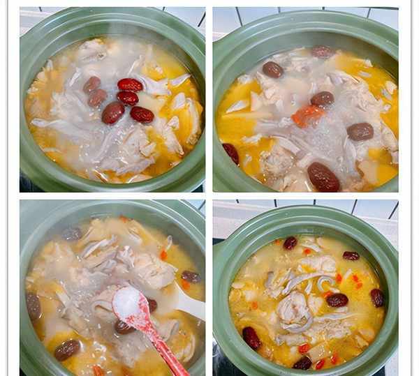 14、快燉煮好的時候,加入紅棗,小火繼續燉煮10分鐘,最後加入枸杞和少許食鹽調味,再煮2分鐘左右,傢庭版豬肚雞湯就完成瞭,湯本身的味道就很鮮美,不要添加過多的調味料;