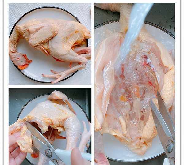 2、先處理走地雞,整雞先用剪刀剪開肚皮,然後放在流動的清水下面沖洗掉表面的血水,把雞屁股剪掉不要,還有雞脖子上的皮,因為上面有很多油脂和淋巴,剪下來之後直接丟棄,再去掉一些雞身上的油脂,全部處理好之後,放在流動的清水下面,完全沖洗幹凈;