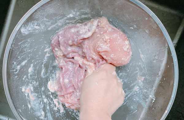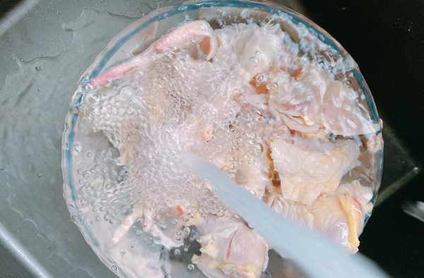 9、焯水的時候,來處理雞肉,浸泡過的雞肉再次放在清水下沖洗幹凈,沖洗好的雞肉是泛白的狀態,沖洗好之後,並瀝幹水分;