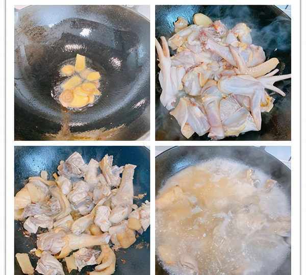 10、鍋燒熱,加入食用油,油溫5成熱,下入薑片爆香,再下入雞肉,大火翻炒,翻炒一會,你會發現,雞肉有微微出水,這時候繼續大火翻炒,翻炒到水分蒸發完,雞肉表面是微微發黃的狀態,說明雞肉中的油脂有一部分已經被翻炒出來瞭,這時候沖入剛燒開的熱水,大火煮,煮15分鐘左右,這是湯汁濃白的關鍵;