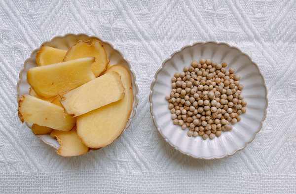 7、再準備豬肚雞湯的配料,配料很簡單,大約50g生薑和10g白胡椒顆粒,這兩種食材能起到很好的去腥效果,白胡椒還有溫中散寒、健脾胃的功效,白胡椒顆粒可以碾碎裝在料包中,白胡椒的多少決定瞭這個湯的辛辣程度,我這個用量的白胡椒煮出來的湯不會很辛辣,老人小孩也適合;