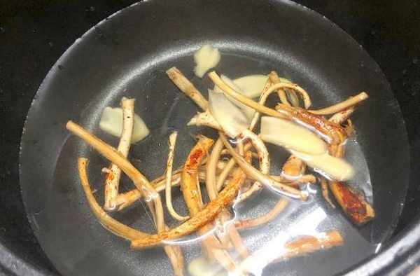 第三步:清水下鍋加入五指毛桃,再加入薑片,大火煮沸。
