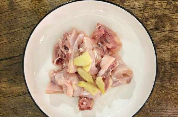 第一步:生薑去皮洗幹凈後切片備用,雞塊洗幹凈後加入適量的鹽,適量的生抽,2勺料酒一起醃制15分鐘。