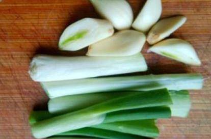 2,香蔥還有大蒜洗幹凈,蔥切段,蒜切成兩瓣。白蘿卜洗幹凈,切成塊。