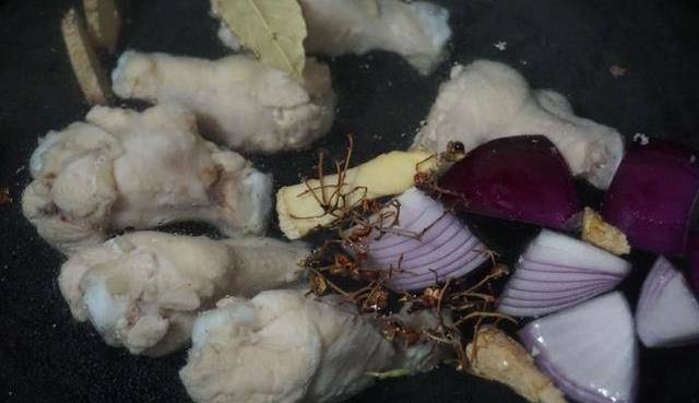 2.雞小肘放入冷水鍋中,加入薑片,洋蔥,花椒粒,香葉開始煮,煮開後有浮沫,我們一定要撇幹凈,不用換水,就要原湯。