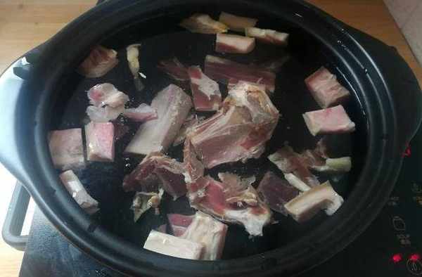 第三步:把火腿肉和火腿骨頭一起放進砂鍋裡,同樣是加冷水加1大勺料酒,開大火煮開5分鐘,撈出來清洗幹凈,這一步是為瞭去掉火腿肉裡過多的鹽分。