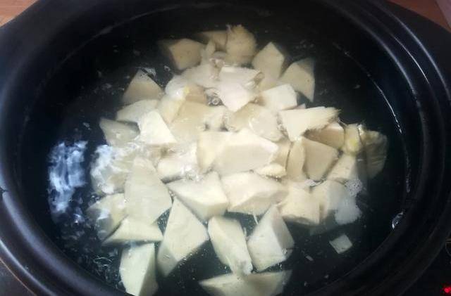 第五步:冬筍切成滾刀塊或者長條,放砂鍋裡焯水煮開3分鐘撈出來清洗幹凈。冬筍跟大多數的竹筍一樣,也含有草酸,最好是焯水再煲湯。