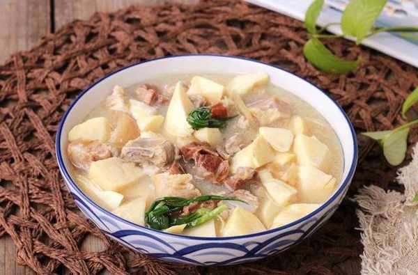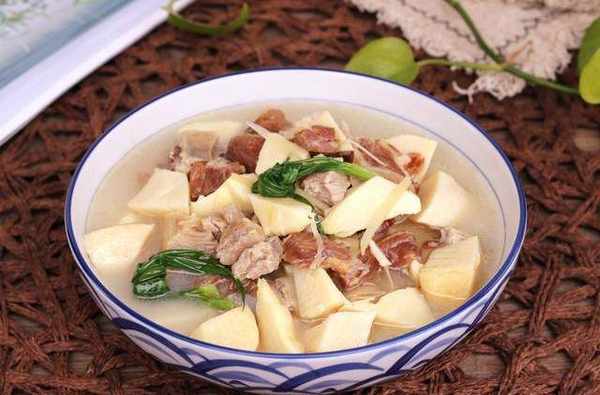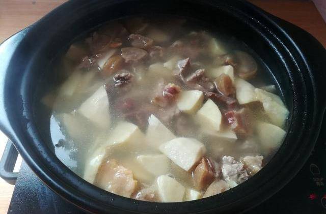 第八步:砂鍋裡的肉湯熬到有些濃白,火腿骨撈出來,放入冬筍中小火煲20分鐘。冬季寒冷,喝湯最養人,冬筍搭配排骨和火腿肉一起煲湯,高蛋白質,高纖維,滋補又暖身。