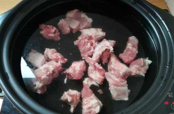 第一步:排骨剁成小塊簡單清洗,加冷水放進砂鍋裡,加1大勺料酒,開大火焯水5分鐘,撈出來沖洗幹凈。