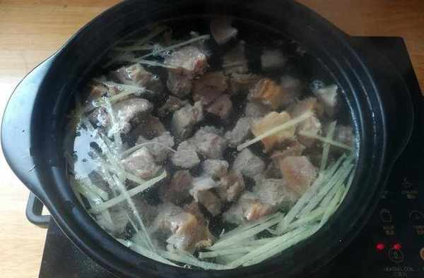 第七步:砂鍋裡重新加水,放入排骨、火腿肉和火腿骨頭,放薑絲大火煮開後轉小火熬1個小時左右。