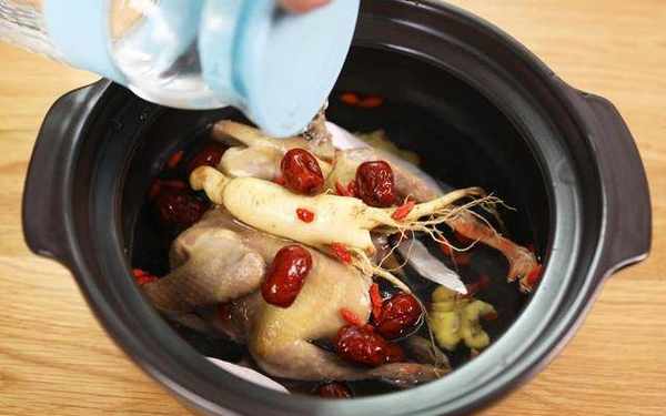 ▼2、準備砂鍋,把鴿子,紅棗,枸杞,人參一起擺在鍋裡,加入純凈水,一隻鴿子約用2500毫升~3000毫升的純凈水即可。