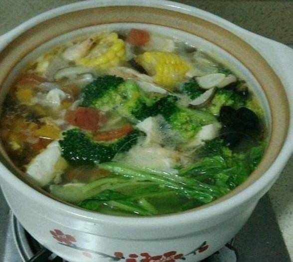2. 水開後放木耳豆腐,加一小勺鹽,煮的差不多放西蘭花、青菜。(總之就是按照菜的易熟程度添加)煮好後,滴幾滴麻油,放點雞精,就可以出鍋啦,嘗一下如果味道不夠再加點鹽,不過蔬菜湯不宜太咸,清淡為主哈。是不是作為減肥餐也不錯,又有營養又不油膩。