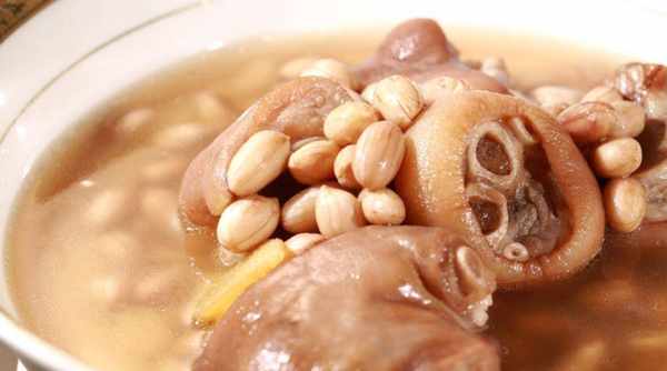 3、豬蹄放入慢燉鍋,加入花生和薑片,倒入溫水至3/4鍋,通電後加蓋慢燉,慢燉4小時後,繼續燜1小時即可食用。