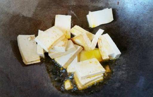 2,鍋裡放油,熱鍋,把豆腐放進去,煎到雙面都金黃就可以撈起來瞭。