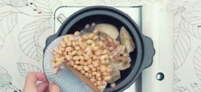 將泡好的花生和蓮藕倒入燉鍋裡,