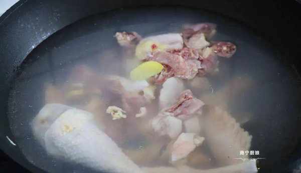 2、起鍋,往鍋裡加入清水、雞肉以及薑片和料酒,給雞肉進行焯水去腥。