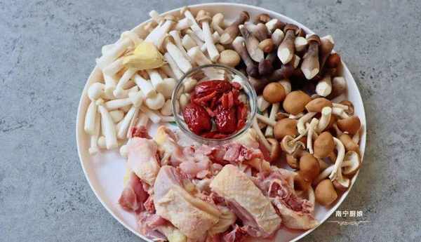 準備食材:老母雞半隻,紅棗、枸杞、生薑適量,雞縱菌、蟹味菌、茶樹菌、海鮮菌各100克。