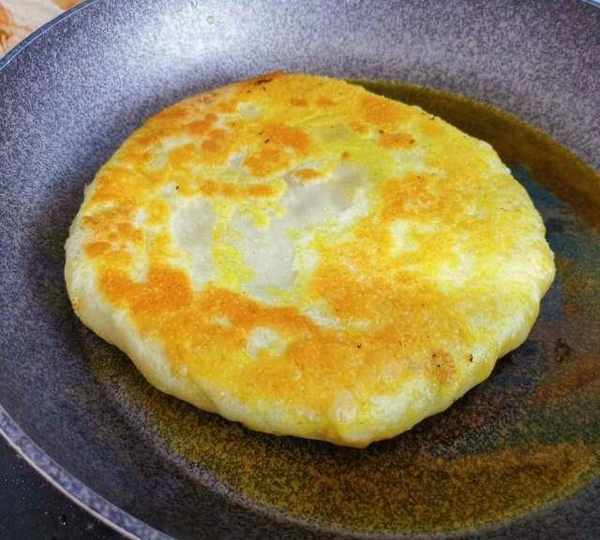 第20步、約三分鐘左右,翻面繼續烙制,烙到兩面金黃,餅鼓起就說明熟瞭。