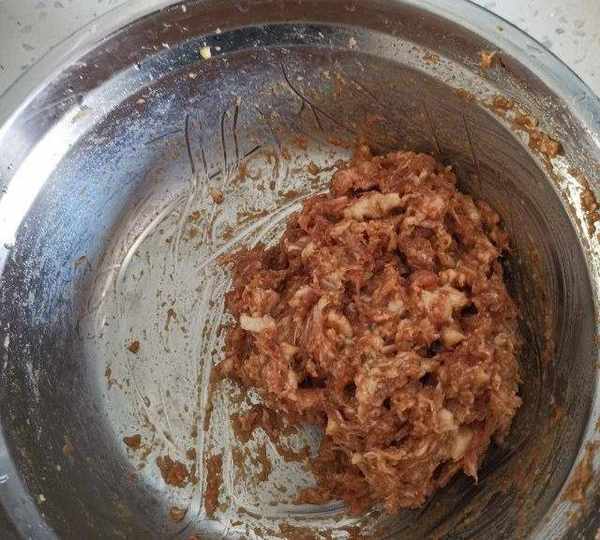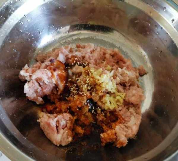 第5步、肉餡中加薑末、精鹽、蠔油、一品鮮醬油、雞精。