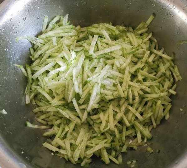 第7步、黃瓜擦成絲,加入少許精鹽剎出水份攥幹。