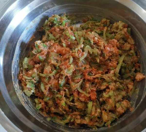 第8步、大蔥切末,攥幹的黃瓜絲都放入肉餡中攪拌均勻。