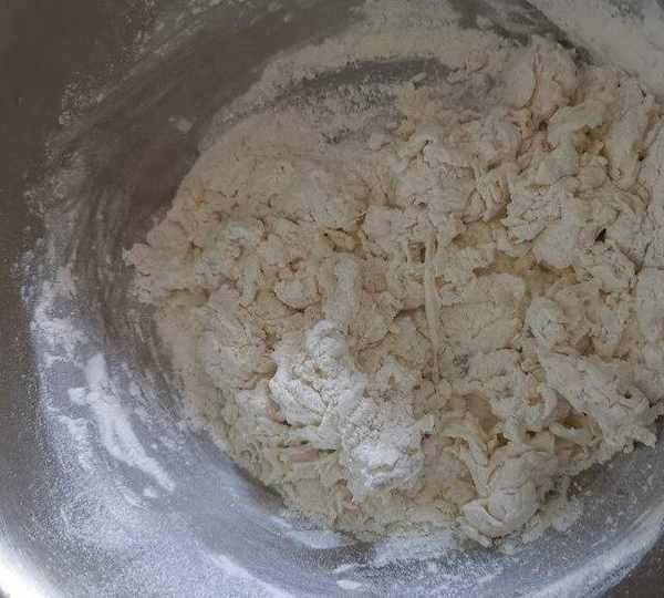 第1步、120克溫水(50度)加入2克鹽攪開,分次加入面粉中攪拌成面絮。