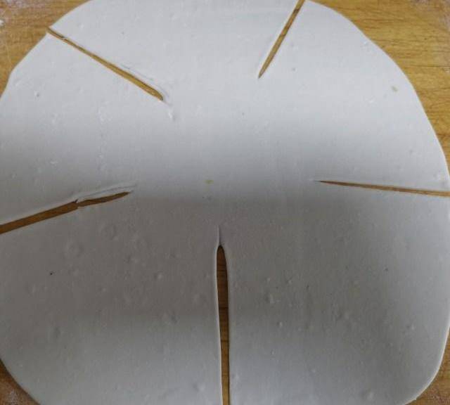 第16步、折第四片,最後剩下的比較大,用搟面杖再搟開一下,抻一抻蓋住整個面團。