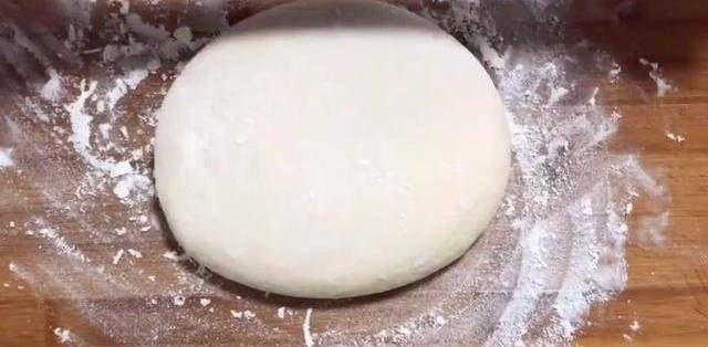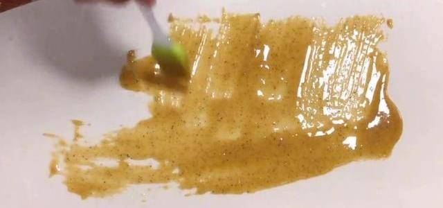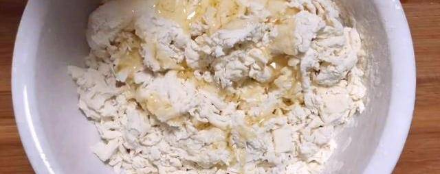最後調成這種流動性比較強的吸油素,這時候我們的面團已經醒好瞭,放到面板上簡單的揉成圓形,用搟面杖搟成薄餅,搟的過程中,大傢一定要多撒上一些幹面粉,防止粘面板,盡量整理成長方形,把調好的油酥放上來,用刷子把它刷開,如果沒有的話可以用刮板。
