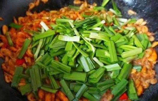 然後我們再加入切好的韭菜,翻炒至韭菜變色就可以盛盤出鍋瞭,這樣非常美味的韭菜炒河蝦就做好瞭。