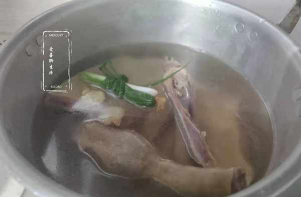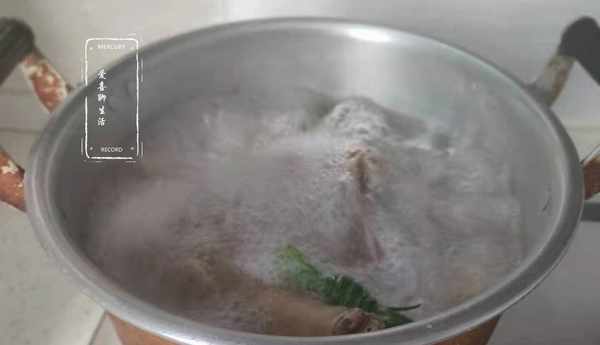 第二步 焯水。接著,把清洗幹凈的鴨子,放入湯鍋中,加入清水,沒過鴨子,再加入蔥結一個,料酒2勺,老薑2片,花椒少許,八角1個,大火燒開。