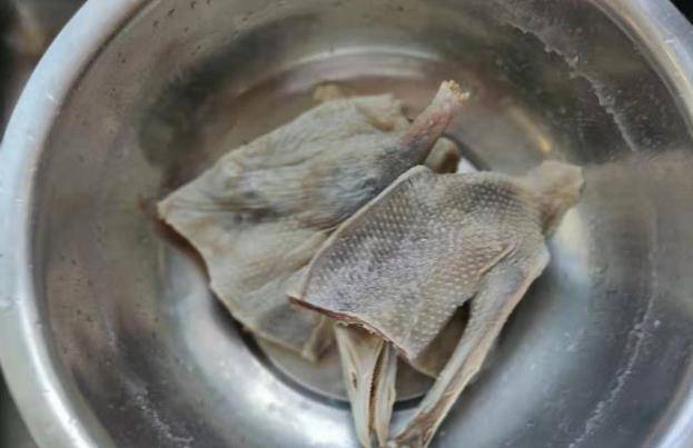 第一步 清洗。先把鹽水鴨拿出來解凍,然後再對半破開,一半繼續存放,一半放入清水中浸泡,浸泡至鴨子完全融化,摘去裡面的油脂和瘀血,再次浸泡清洗。看盆上都是油脂,所以一定要洗幹凈。