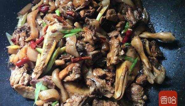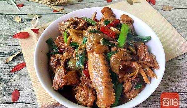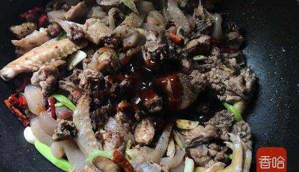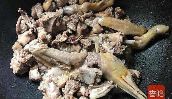 6.鍋中放油燒熱,倒入鴨子炒幹水分,炒出香味裝盤備用