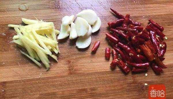 4.薑切絲,蒜切片,幹辣椒切段
