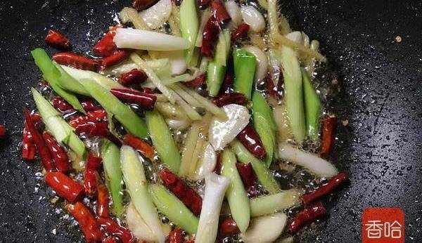 7.鍋中放油,倒入薑、蒜、蒜苗,幹辣椒炒香