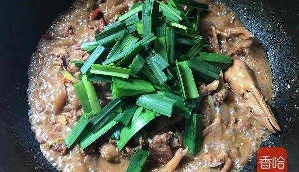 12.調入適量的鹽翻勻,再放入蒜苗葉翻勻(湯汁不用收的太幹)