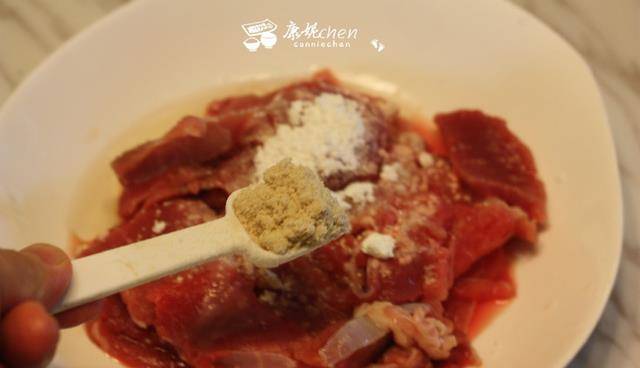 2牛肉切片,用鹽、黑胡椒、生抽、雞粉和油醃制片刻,雞粉有鮮味又有嫩肉的作用,可以增進食欲