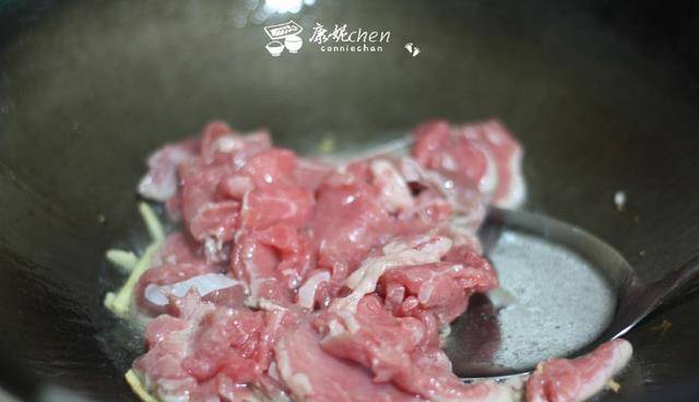 5炒鍋燒熱油,爆香薑蒜,放牛肉片翻炒