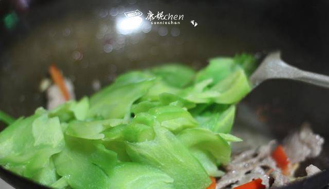 6當牛肉炒得差不多熟,還有點微紅,放紅彩椒條和苦瓜片,翻炒