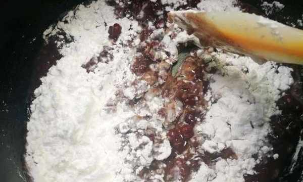 第二步:煮好的紅豆趁熱加入70g糖和100g白薯粉拌勻,白薯粉必須趁熱放入才能漿化,否則沉淀成層。
