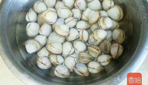 2.蛤蜊放鹽水中浸泡幹凈,然後用手搓幹凈
