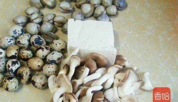 1.準備好蛤蜊,蘑菇,豆腐,鵪鶉蛋